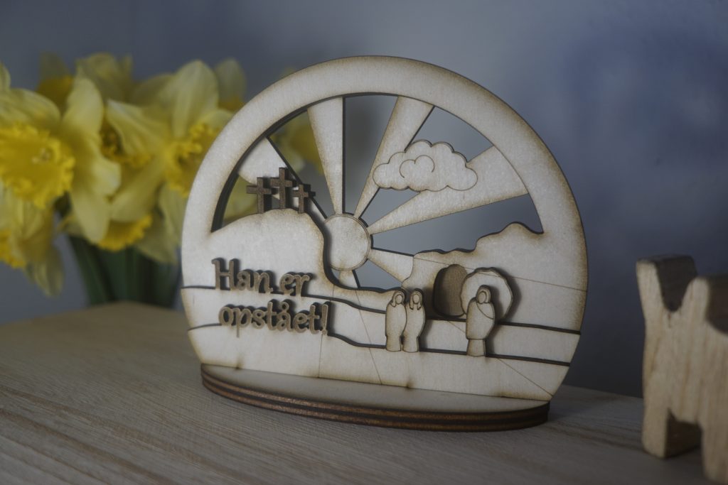 Vi har lavet et design, som er udskåret i træ med flere lag og graveringer, som fortæller om nogle af de vigtigste elementer af påsken.